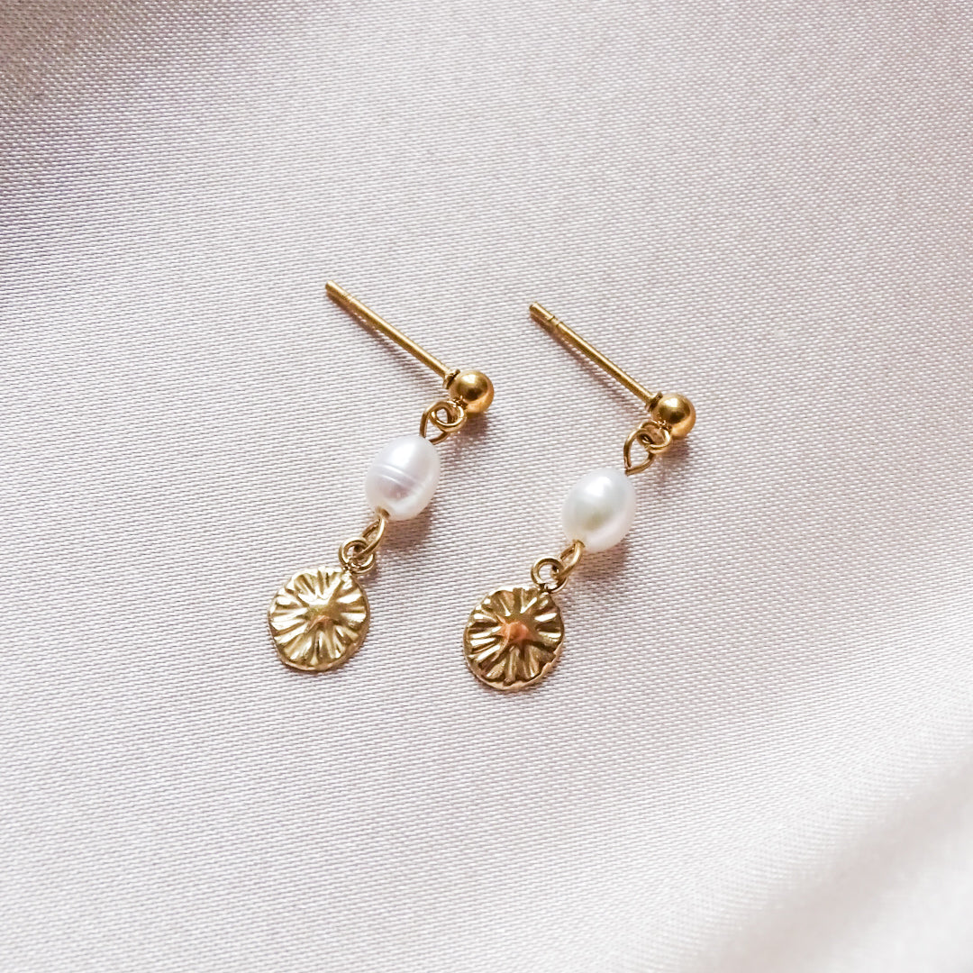 Timbres soleil extra mini en acier inoxydable plaqué or 18 carats avec de magnifiques perles d'eau douce.