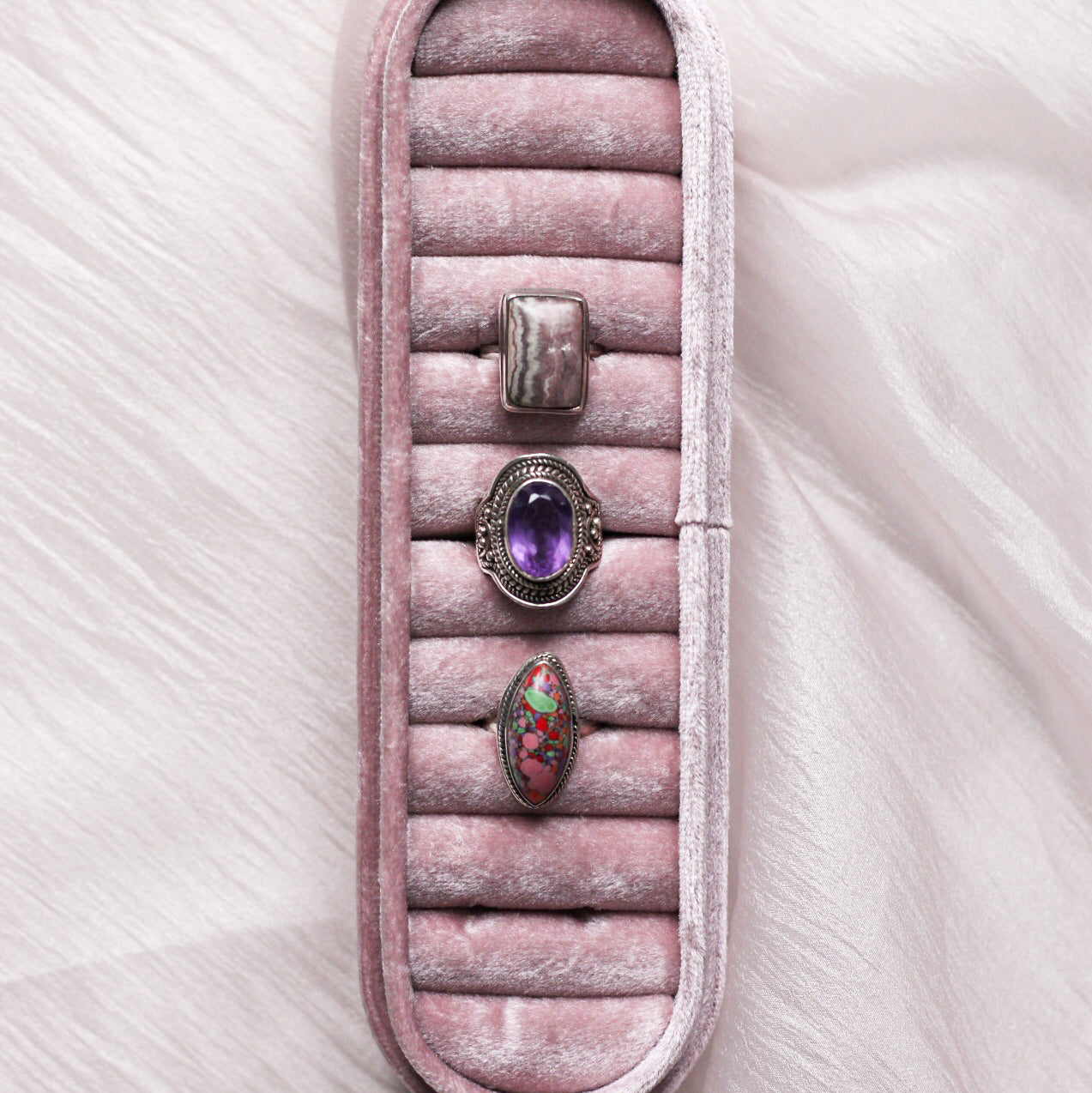 #3 (Right): Mosaic jasper ring. Stone dimensions: 10x23mm. Ring size: 7