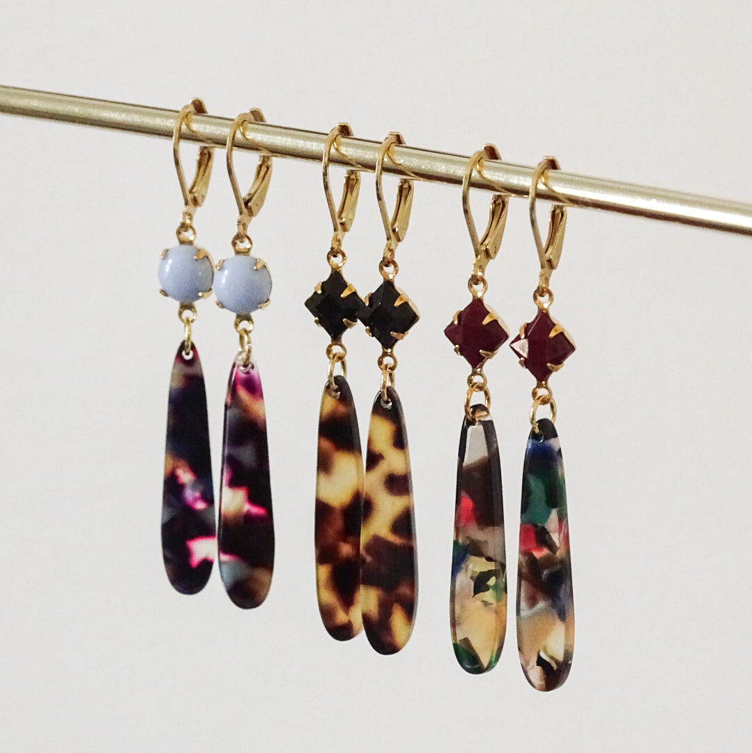 Materials: Gold plated stainless steel ear wires & pendants (hypoallergenic), vintage German glass cabochons & cellulose acetate pendants (plant based biodegradable plastic).