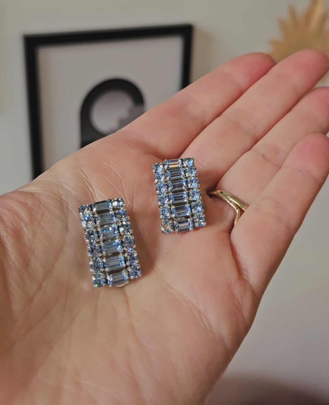 *Vintage treasure* Gustave Sherman mid-century small light blue crystal clip-on baguette earrings (signed)